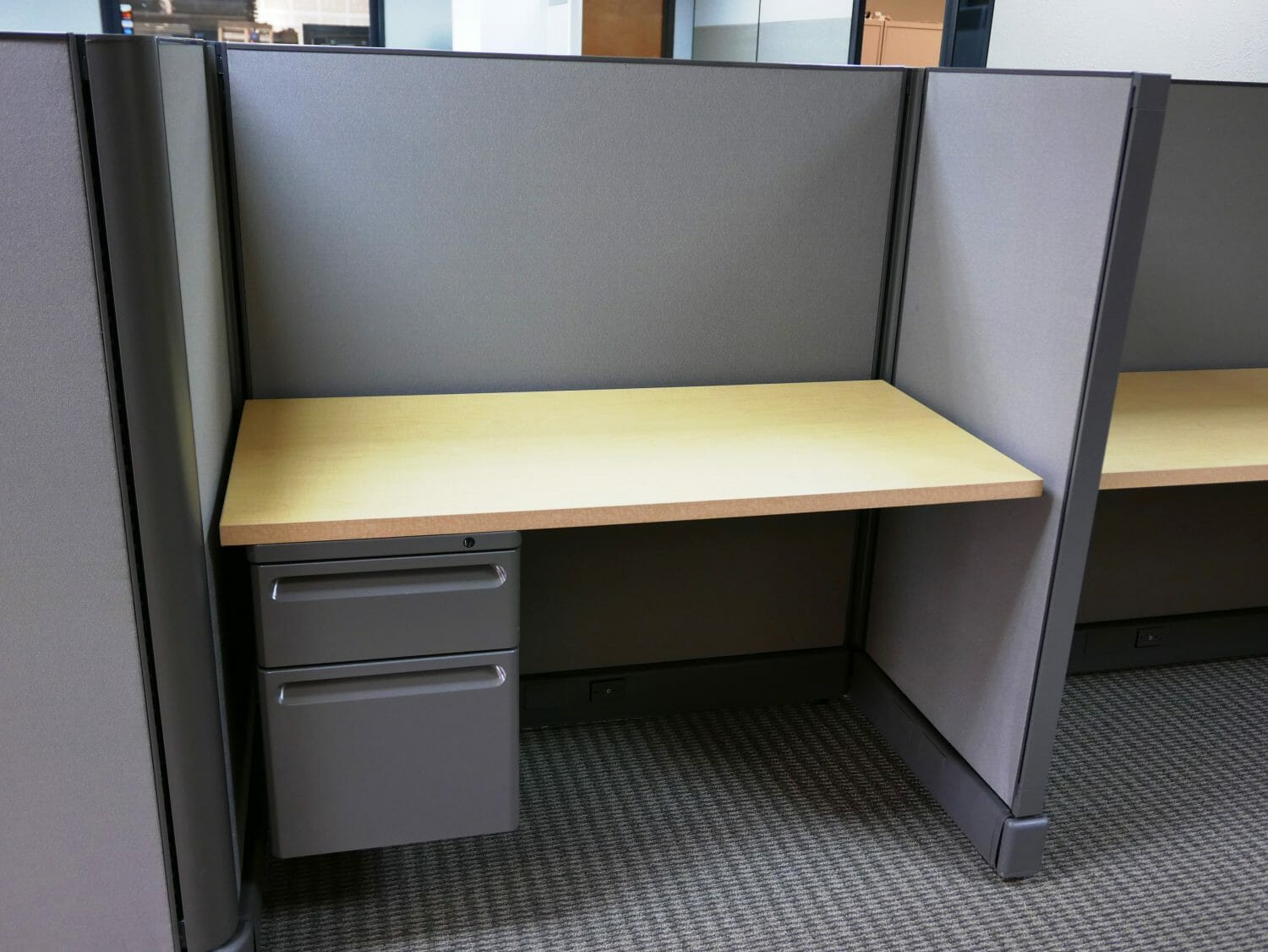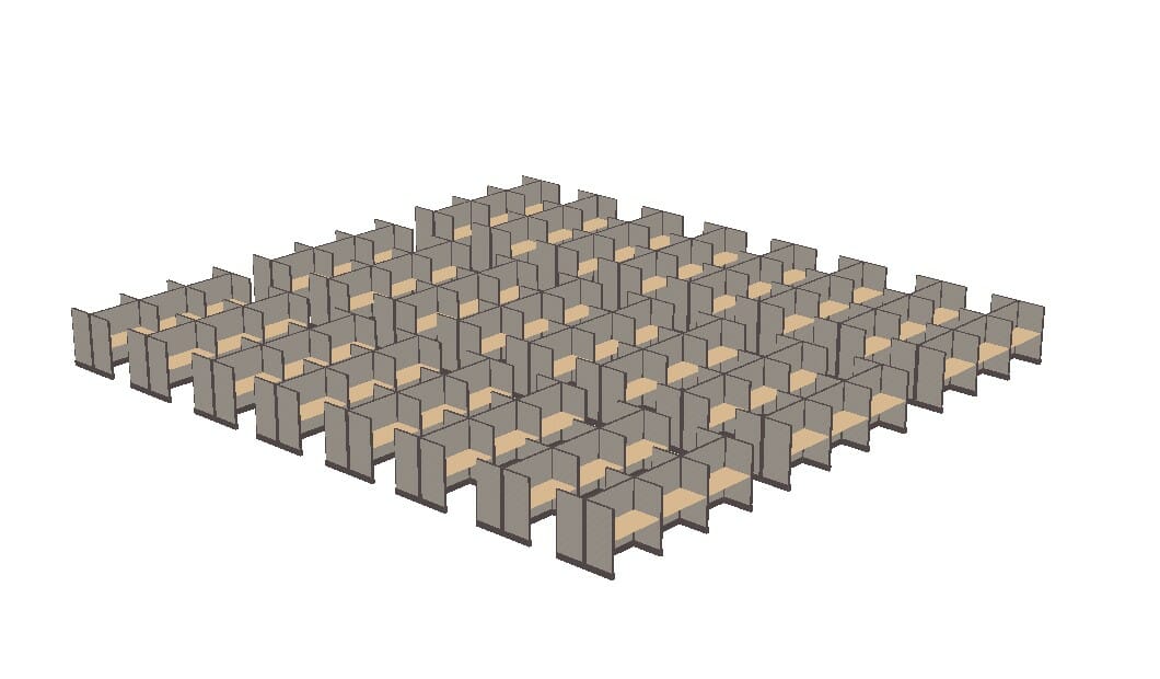 4×2 call center cubicles 53″ panel height. Each cubicle consist of (1) 48×24 worksurface, (1) box/file storage pedestal, 8 wire 4-circuit power down the spine, each office cubicles has (1) duplex receptacle, Built in pods of 12.