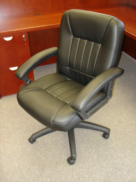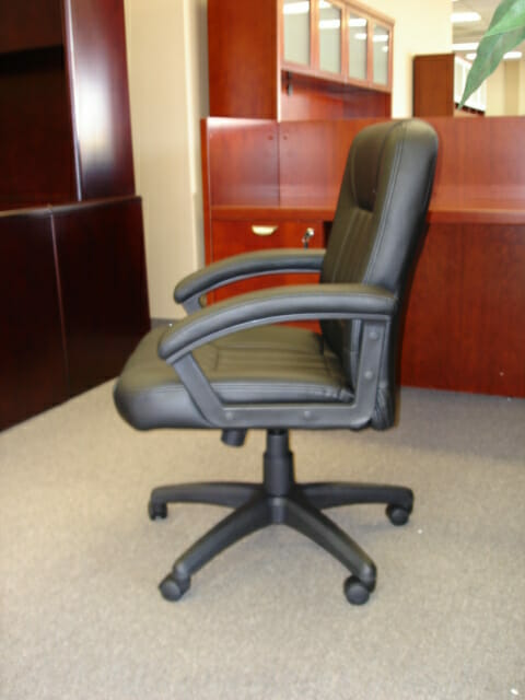 Experience comfort while at work with the Office Star mid-back executive black leather chair. This great piece of office furniture features contour seat and back with built-in lumbar support. This versatile desk chair has pneumatic seat height adjustment.