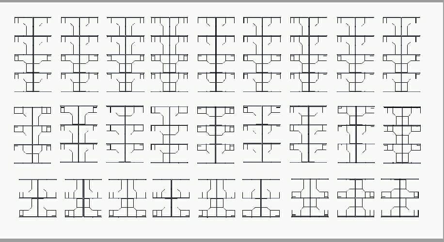 Built in pods of 4 cubicles, 6 cubicles, and 8 cubicles. Power down the spine walls with 3 receptacles per office cubicle.